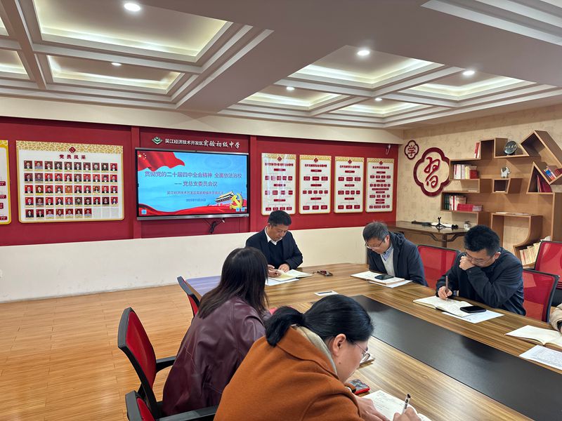 11月24日,吴江开发区初中党总支召开“贯彻党的二十届四中全会精神,全面依法治校”专题委员会议,研究布置以法治方式推进学校治理体系和治理能力现代化的“施工图”。党总支书记吴青峰同志主持会议。